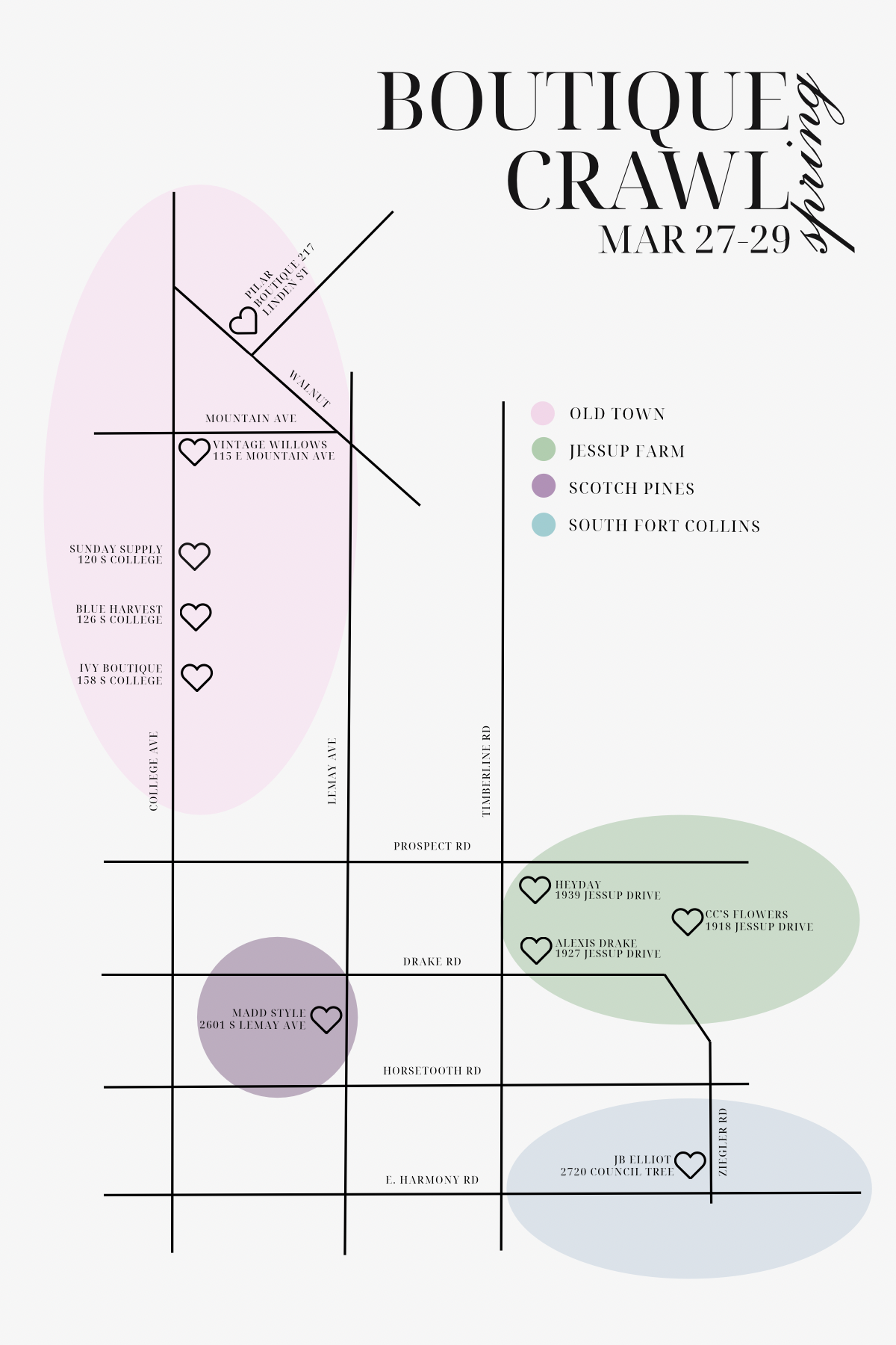 Kick off the season with a shopping experience like no other! Visit our participating boutiques from March 27-29th to pick up your passport and join the crawl! All eligible participants will be entered to win prizes valued over $1000. Experience exclusive in-store gifts, discounts, giveaways and more at some of your favorite shops in Fort Collins!